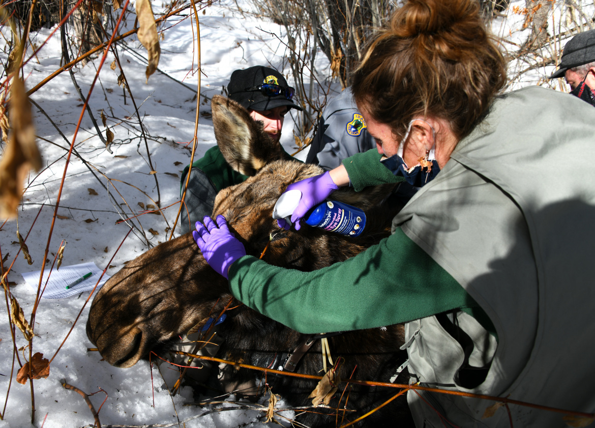An antibiotic spray is applied to the eyes of a cow moose in Hailey