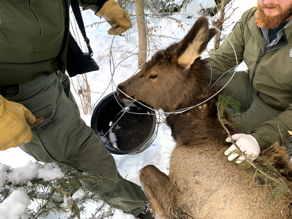 In this instance, the elk was successfully anesthetized, and the metal tomato cage and plastic bucket were removed.